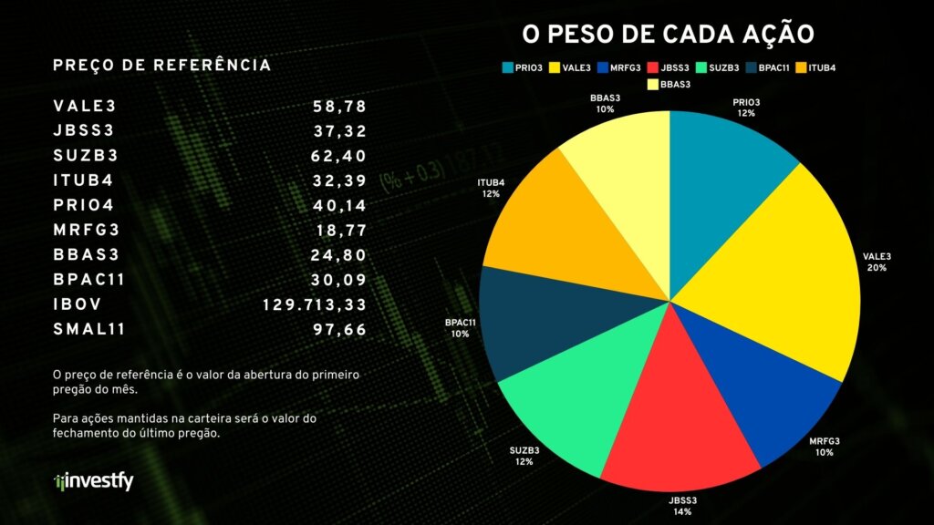 Observação: Nenhuma ação ou BDR pode ter mais de 20% de peso na carteira. Caso alguma ação tenha mais de 20% dos votos, eles serão distribuídos proporcionalmente entre as outras escolhidas.