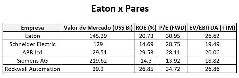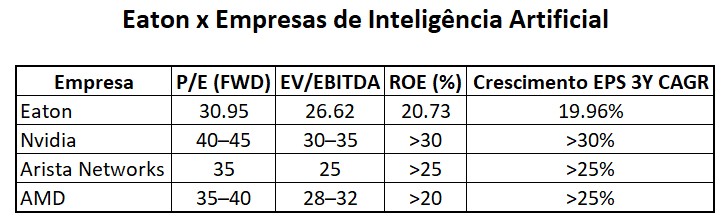 Comparando Eaton com os pares, vemos a empresa bem precificada e multiplos mais elevados, embora um pouco mais conservadores que empresas puramente focadas em IA e ligadas na tese de inteligência artifical.