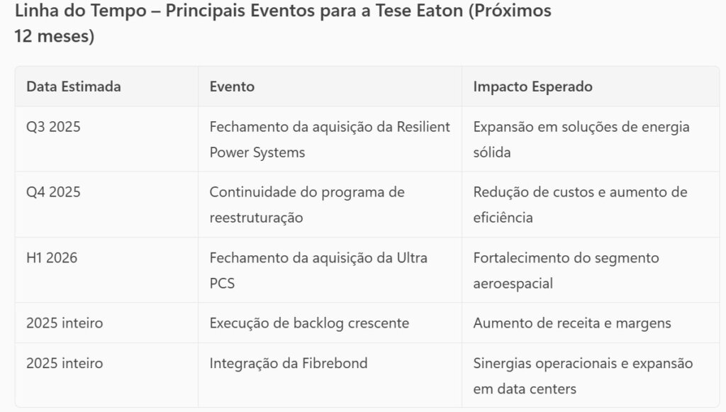 Eaton representa uma tese de investimento com bons fundamentos, gestão disciplinada, e alinhamento com megatendências estruturais. A combinação de crescimento orgânico, aquisições estratégicas e exposição à eletrificação e IA cria uma assimetria interessante para o longo prazo, embora o valuation atual esteja elevado e já embute boa parte das expectativas de resultados futuros.