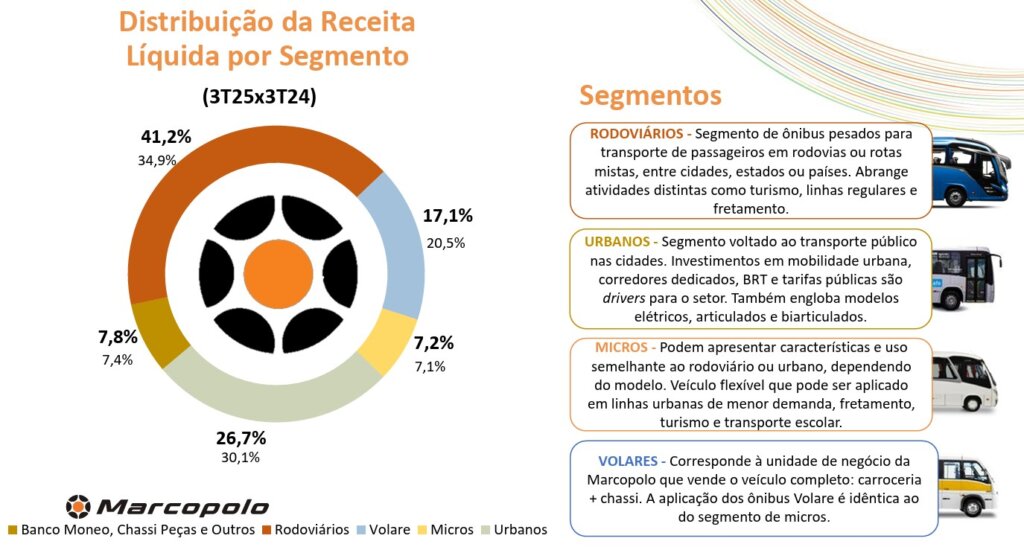 A Marcopolo atua na produção de carrocerias de ônibus, com receita distribuída entre os segmentos: