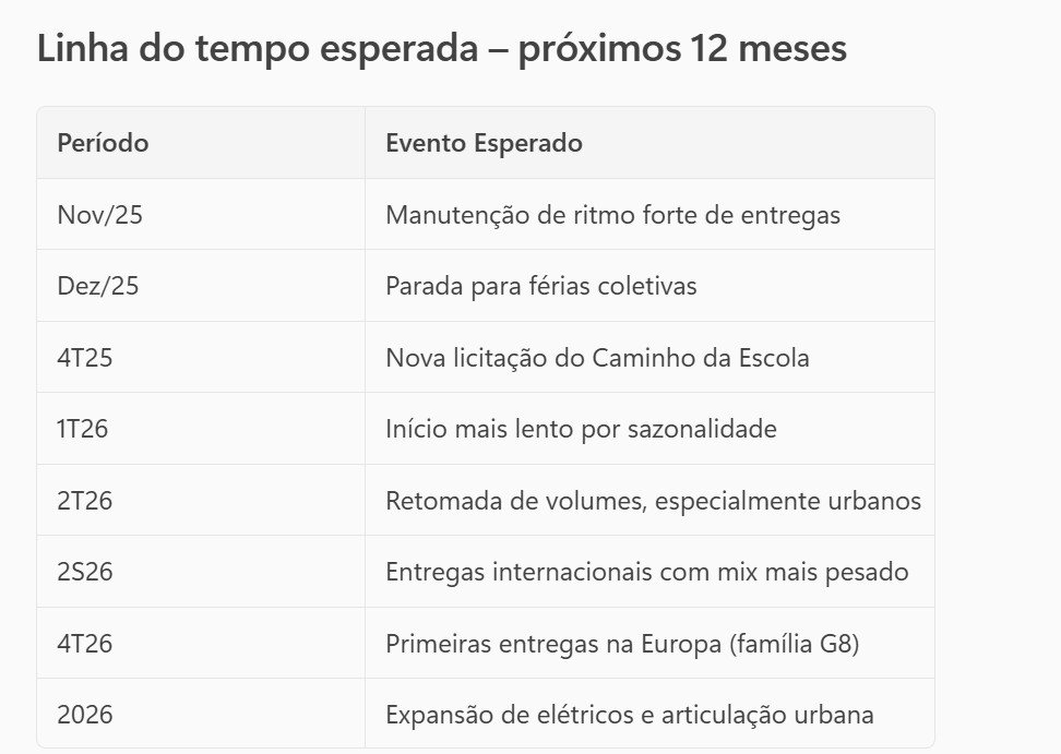- Programa Caminho da Escola: nova licitação esperada para o 4T25, com entregas previstas para 2026.
