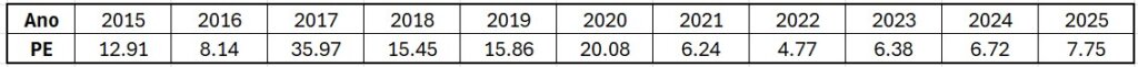 Nos ultimos 10 anos, poucas vezes a empresa negociou abaixo de 7x PE ( preço sobre lucro). Com a perspectiva de 1S2026 mais fraco, poderemos ver novamente a empresa negociando em patamares bem interessantes.