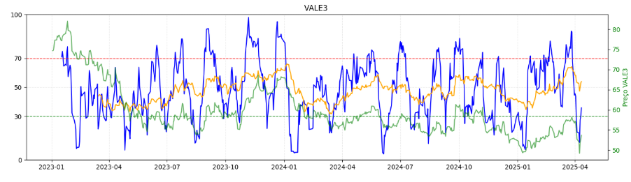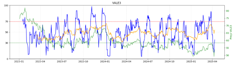 VALE3 testou na semana passada a mínima do ano, região e momento (janeiro) onde ambos osciladores – de curto e médio prazo – estavam sobrevendidos. Com alívio de risco, seguindo o Minério, qualquer repique é bem possível. Foi um ativo que apresentou fluxo e performance relativa no ultimo pregão.