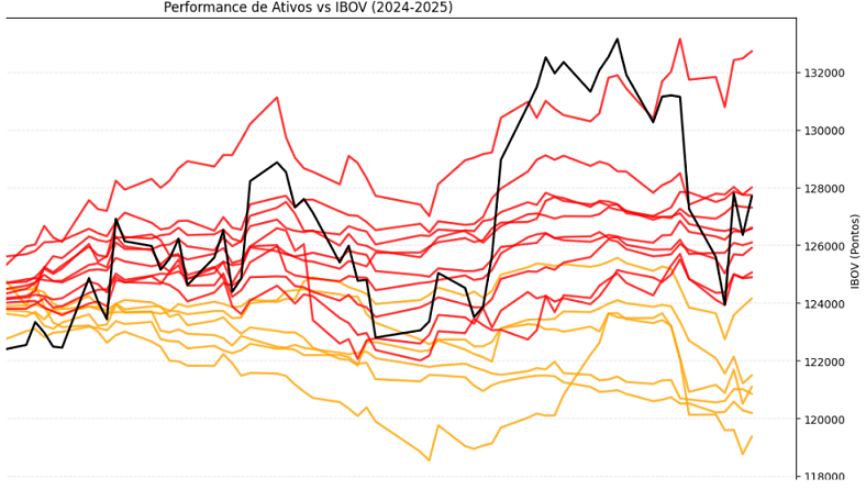 Os papéis de CMDTYS, especialmente VALE3 e PETR4 foram um “peso” para o índice nos últimos dias. As CMDTYS estão no “olho do furacão” da guerra tarifária, foram altamente impactadas e causaram quedas consideráveis nas cotações dos ativos.