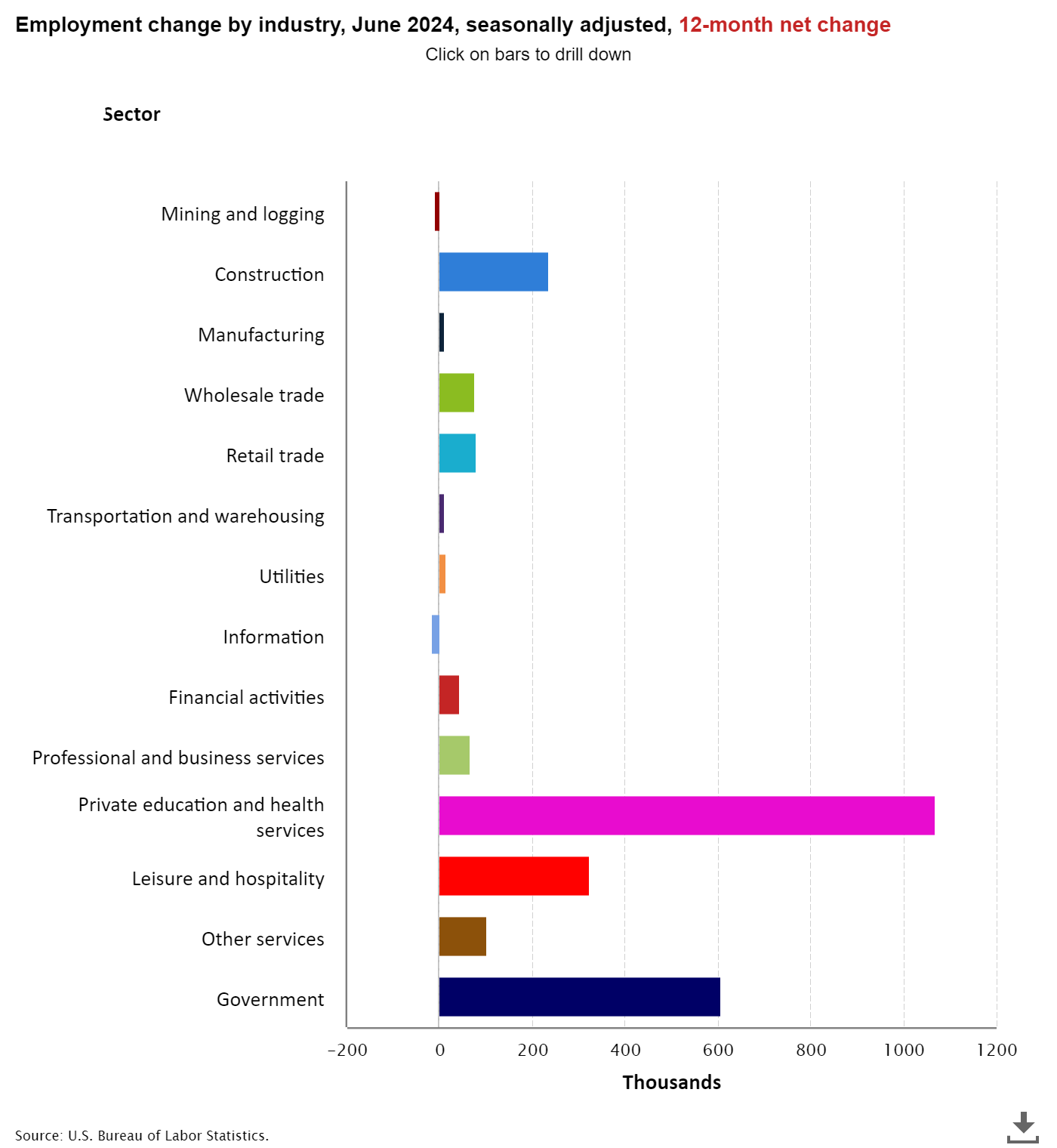 Vale ressaltar que poucos setores estão se destacando e representando a grande maioria de todo o crescimento dos empregos no país. No dado divulgado sexta, somente Governo, Assistência média e Educação privada representam 74% dos empregos criados. Se adicionar Construção, 87%. A imagem abaixo mostra que isso tem ocorrido nos últimos 12 meses com o setor de lazer e hospitalidade também se destacando.