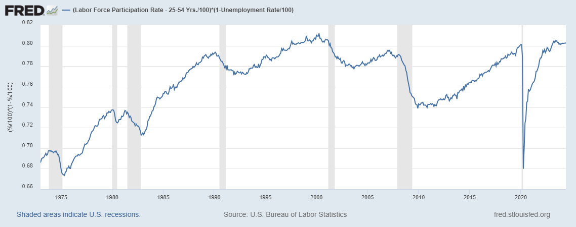 O segundo dado é a participação da força de trabalho de adultos entre 25-54, que se encontra estável em níveis altos historicamente.
