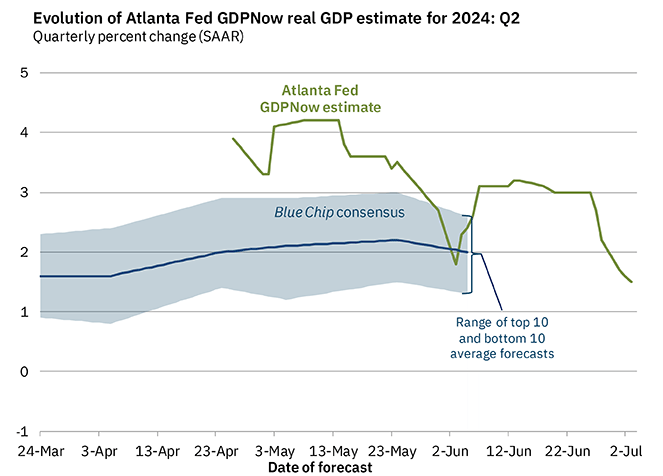 E para finalizar os dados de alta frequência, as revisões de expectativas do PIB para o segundo trimestre. Um dos pontos mais comentados da força do mercado de ações americano, foi pelas consecutivas revisões para cima do crescimento. Iniciamos o ano com expectativas para o fim de 2024 na casa de 1.0% a.a e que foram revisadas ao longo do primeiro semestre para 2.2%. Essas fortes revisões ajudaram bolsa e juros para cima. Já nos últimos meses, o GDP Now do Federal Reserve de Atlanta, vem revisando para baixo a expectativa do PIB para o 2º trimestre, ficando abaixo das expectativas do mercado pela primeira vez depois de algum tempo.