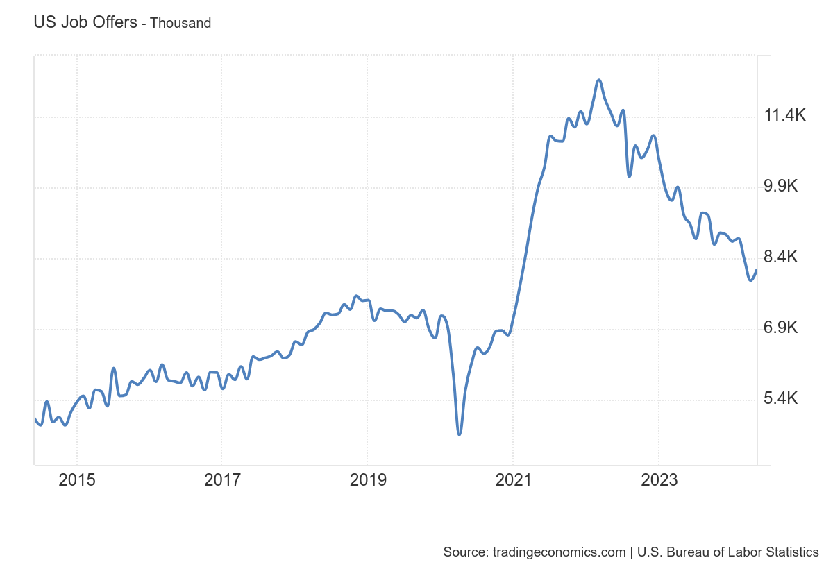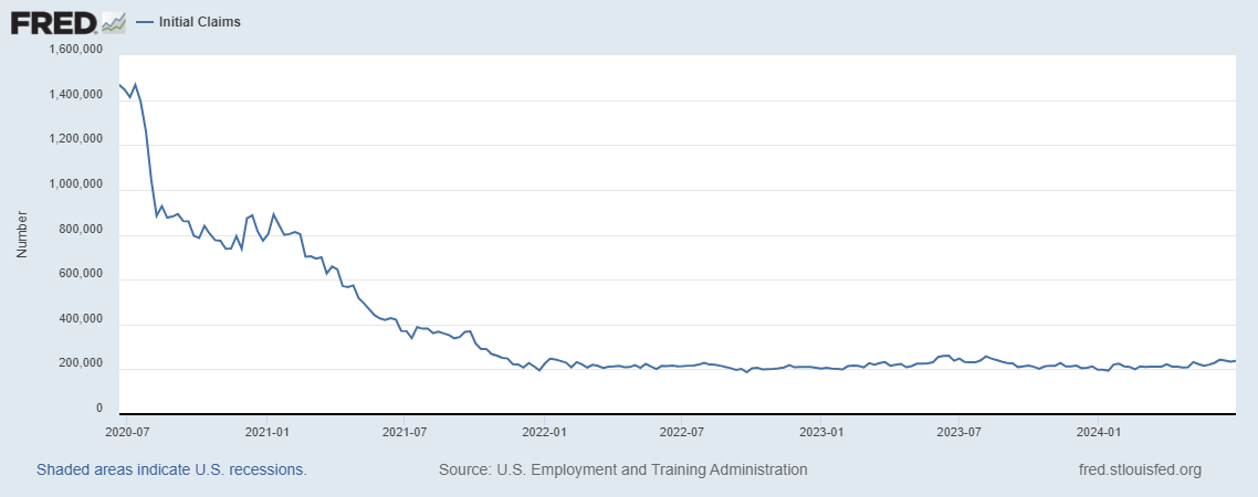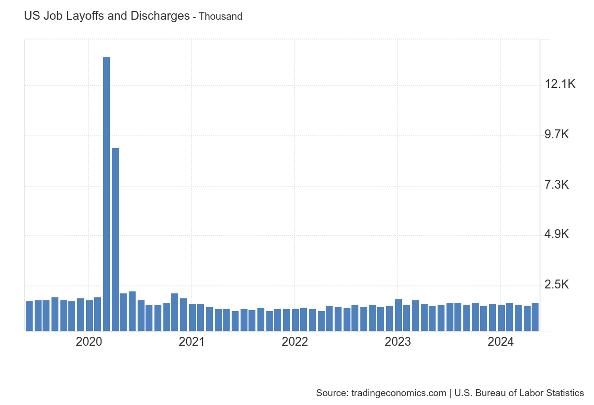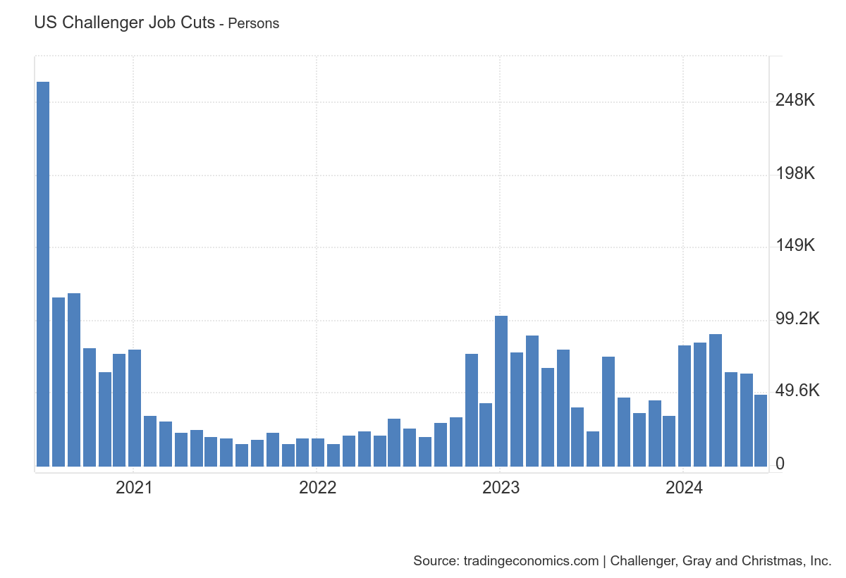 E em complemento aos dados de Layoffs, o Challenger Job Cuts também mostra numeros sem muita expressividade e até uma suavização nas ultimas impressões.