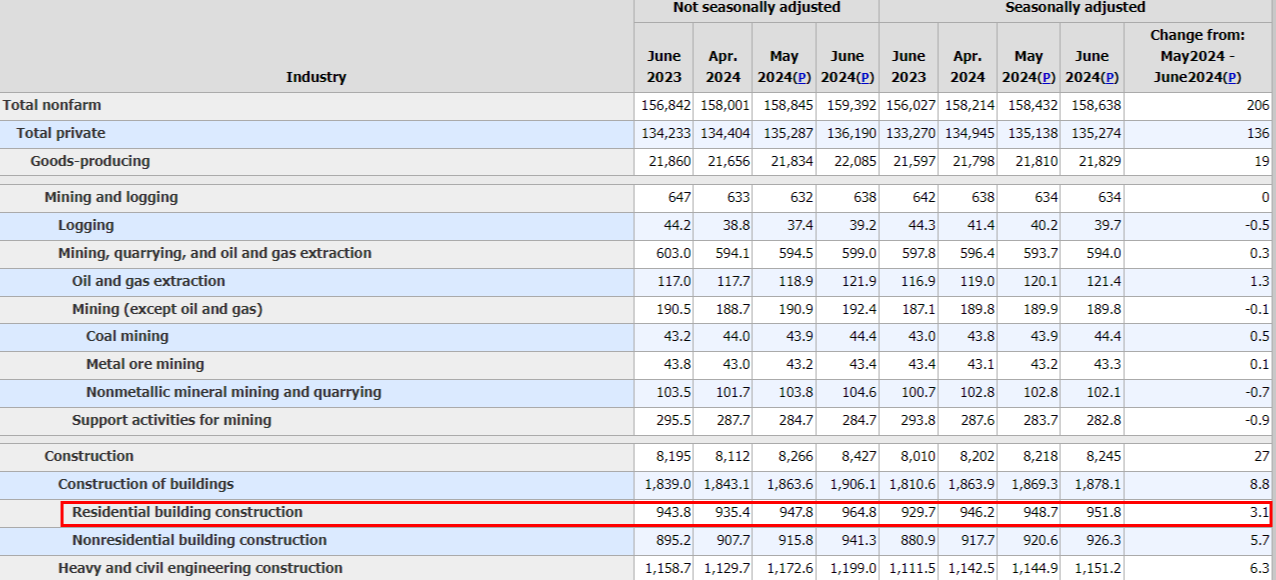 O últimos dado também vem de outra casa de research. O Warren Pies da 3Fourteen Research traz a observação de que os dados de emprego para o subgrupo Construção Residencial foi um bom leading para períodos recessivos nos últimos anos, mostrando que quando esse subgrupo começa a mostrar queda nos empregados, um recessão pode estar a caminho. Aqui trago 2 imagens, a primeira a própria tabela do BLS da última divulgação de sexta mostrando que segue em crescimento nos últimos 12 meses e continuou aumentando acima de máximas recentes nesse ciclo.