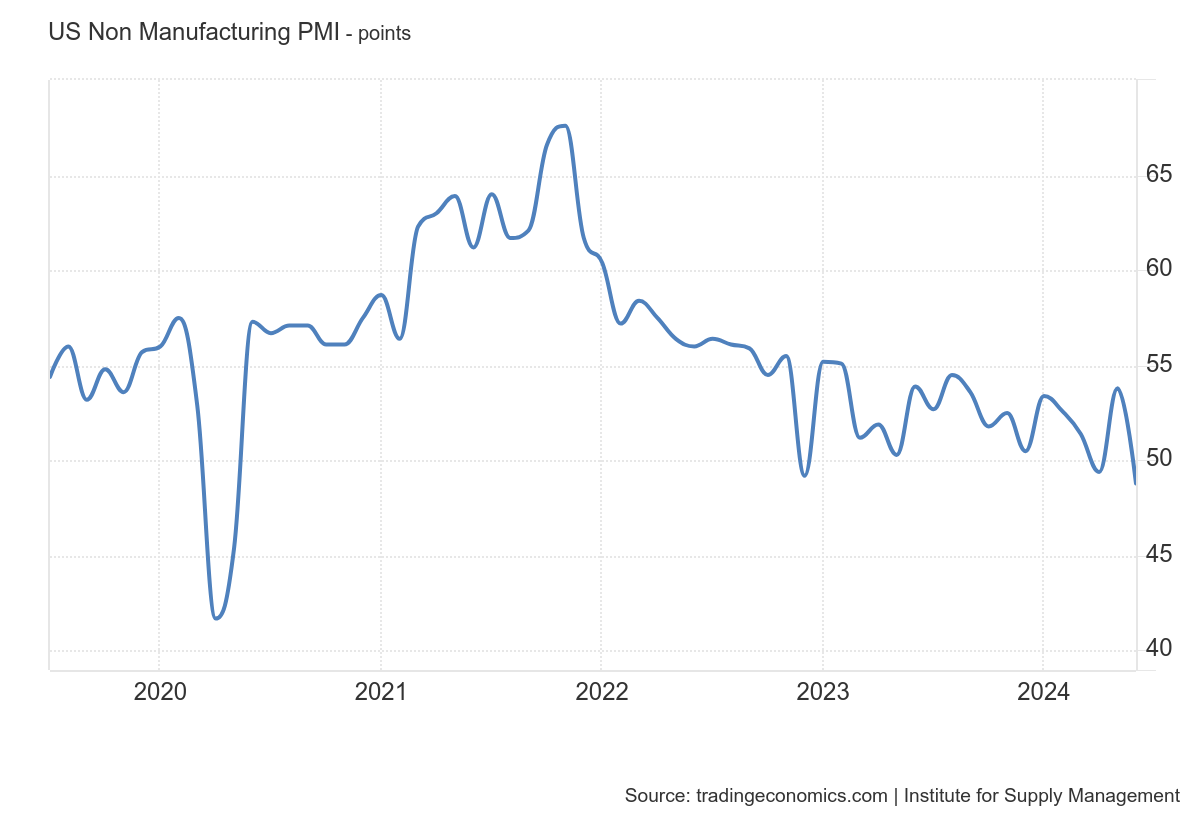 A economia americana é muito influenciada pelo setor de serviços e a divulgação do PMI de Serviços foi uma grande surpresa para todos. O índice caiu 5 pontos de um mês para o outro saindo do patamar de expansão, para contração em 48.8. Clara desaceleração, o que surge questionamentos sobre a saúde desse setor.