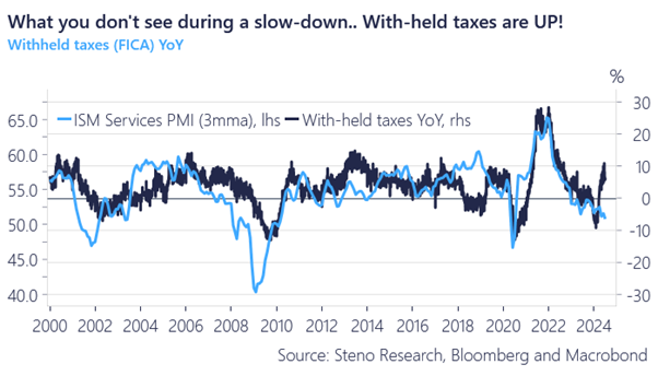 A próxima imagem é um dado bem interessante que o Andreas Steno da Steno Research trouxe em seu twitter essa semana. A imagem mostra as with-held taxes crescendo, e o que ele traz de observação é que não identificamos aumentos dos numeros de impostos retidos de trabalhadores sem que um mercado de trabalho esteja saudável e com bastante empregados, achei um ponto interessante.