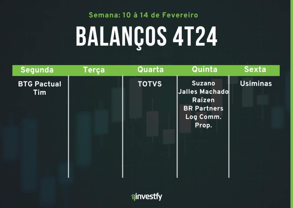 - Temporada de balanços ainda no início, com destaque para Tim, BTG Pactual, Suzano, Usiminas, Raízen e Porto.