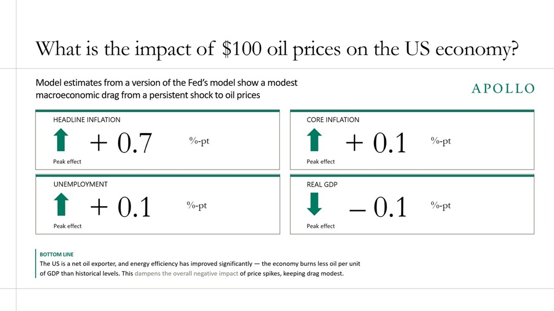 Um estudo da Apollo Management sugere impacto muito moderado da alta do petróleo sobre a inflação. Apesar da gasolina ter peso superior a 3% na inflação, a economia americana é exportadora de energia e, portanto, menos dependente do petróleo.
