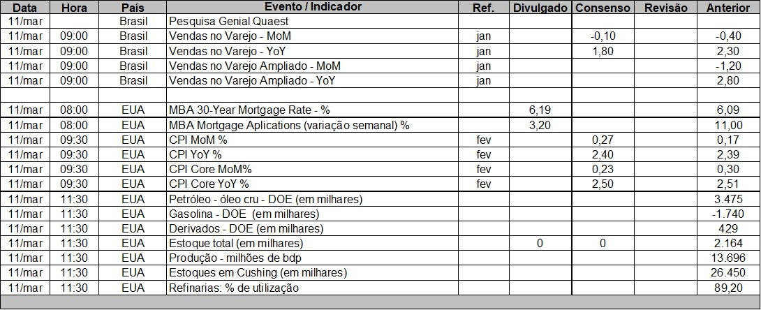 A Oracle sobe 11%, impulsionada por resultados sólidos e perspectivas positivas. Os investidores aguardam a divulgação do CPI de fevereiro hoje, embora o dado seja considerado “antigo”, pois reflete um período anterior ao início da guerra.