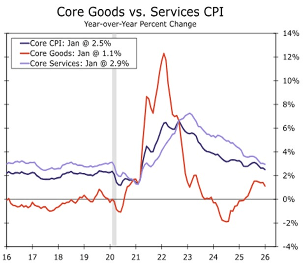Observa-se que a inflação de bens está em queda, assim como a de serviços. As tarifas podem ter elevado levemente a inflação, mas sem impacto relevante, conforme apontado nas análises desde 2024.