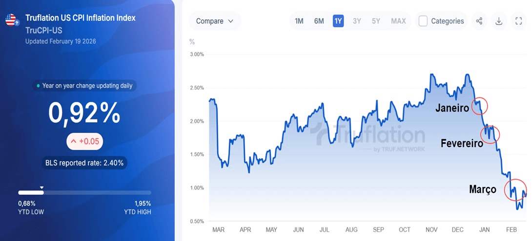 Seguimos mais atentos aos dados de CPI de fevereiro e março, que serão divulgados em 11 de março e 10 de abril, respectivamente. Segundo o Truflation, a inflação nesses dois meses deve vir abaixo do previsto, com destaque para um provável número bastante fraco em março.