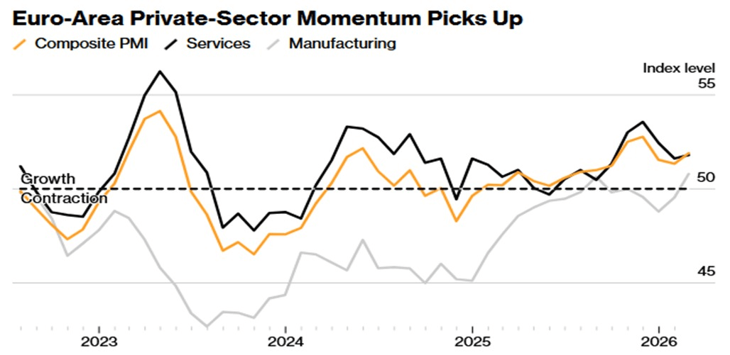 PMI da zona do euro de fevereiro (prévia) veio acima do previsto, impulsionado pelo índice da manufatura, que atingiu o maior nível desde 2022. O PMI industrial alemão rompeu para cima a linha d’água de 50 pontos pela primeira vez em três anos e meio, devido ao aumento de gastos públicos em infraestrutura e defesa, sendo o principal índice a impulsionar o PMI da região.