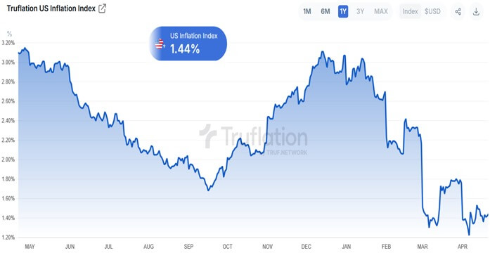 Abaixo o gráfico da inflação on-line dos EUA medida pela Truflation. Por ora, a inflação parece que ainda não acelerou, mas as dúvidas com relação as tarifas persistem e o Fed está muito receoso de cortar juros, ainda mais porque o mercado de trabalho, até o dado do Payroll de março e com base nos dados semanais de pedidos de auxílio desemprego, segue em bom estado e resiliente.