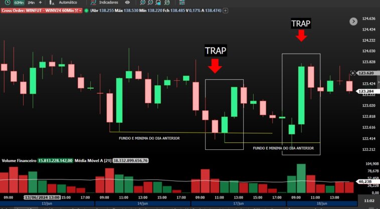 Notem que ele fez uma trap na perda da mínima do dia e no dia seguinte ele repetiu a mesma armadilha. Também é comum o mercado repetir a estratégia.