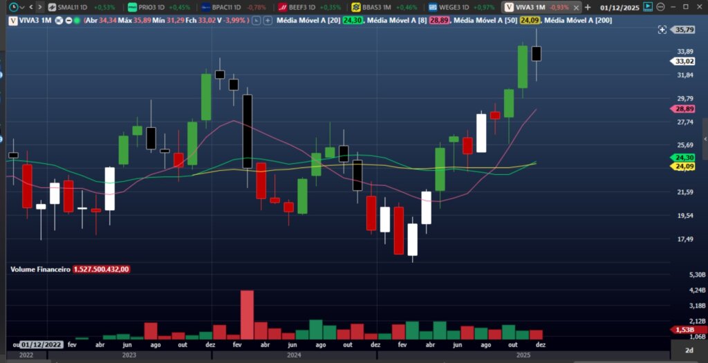 Quando analisamos o gráfico mensal, o qual ao meu ver apresenta maior correlação com os fundamentos de longo prazo, vemos que o preço atingiu o ATH após longo inverno, refletindo a melhora na governança da empresa e a estratégia de crescimento sustentado com resultados sólidos.
