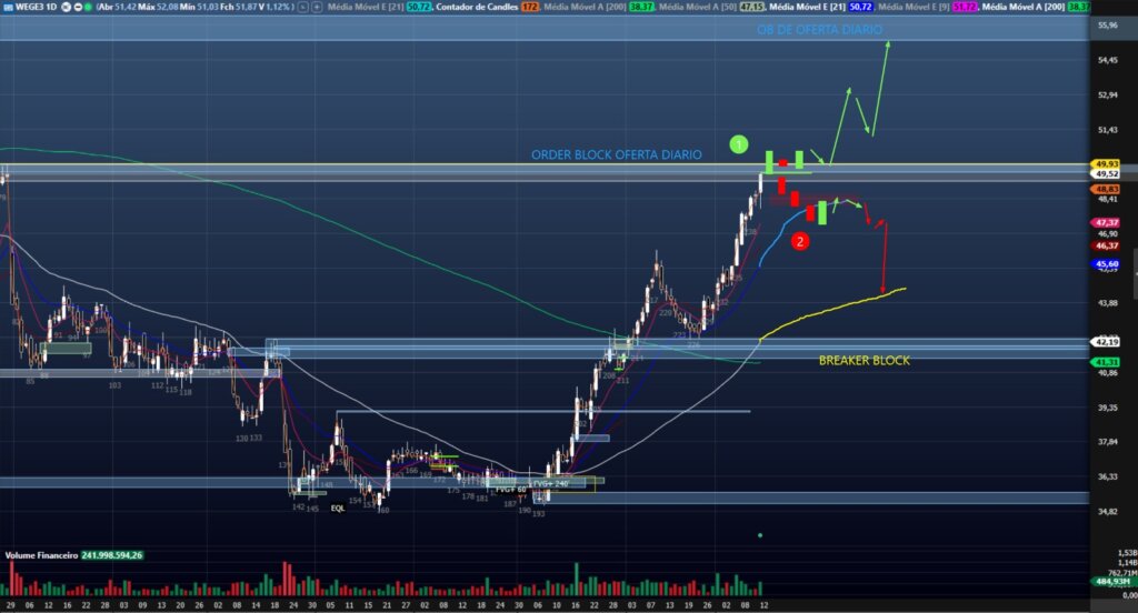1 – Compra caso rompa e confirme acima da região, sendo necessário para isso dois fechamentos com candles positivos acima do 49,90. Essa compra pode ser feita no fechamento desse segundo candle ou esperar uma correção em região de ineficiência dentro da Order Block que vira um Breaker Block. Em ambos os casos, tenho como alvo final a próxima região de oferta no 55,31-56,37. Atentar para o gerenciamento visto que é uma entrada em topo. Pode-se usar o fundo do Breaker Block como stop (ou rompimento da mínima do primeiro candle do diário a fechar abaixo do Breaker Block). Caso as mm curtas cheguem na região, passam a ser um bom ponto de suporte.