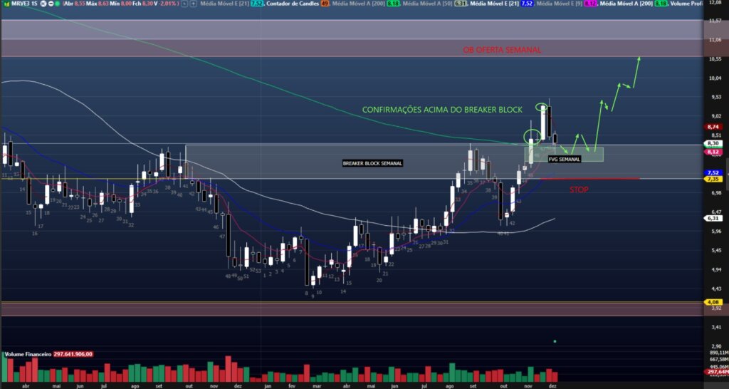 MRVE3 quebrou agora em novembro uma tendência baixista e trabalha acima das medias curtas, mm50 e mm200. Fez duas confirmações do preço acima do Breaker Block, na região do 7,36-8,22 e fez um teste na ineficiência gerada (FVG semanal no 7,82-8,18). Toda região do Breaker Block serve de ancoragem para compras, com stop abaixo da mmE21 e do fundo da região. Tem como alvo a próxima região de oferta do semanal no 10,61-11,58. Na pior das entradas, pode-se buscar um payoff de 3.