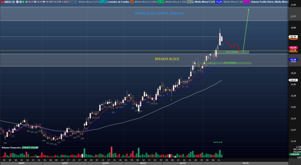 ABEV é um ativo que vem trabalhando em uma lateralidade ampla desde 2019, tornando as compras após grandes pernadas de alta muito perigosas. Desde o ultimo teste de fundo em fevereiro de 2025 tivemos uma boa formação de fundos e topos ascendentes com excelente retorno. No dia 10/02, enfim tivemos uma confirmação acima de região de oferta formada ainda em 2019 e testada em 2021. No semanal confirmamos esse ótimo fechamento. Agora vejo essa região de oferta (agora Breaker Block) como um ótimo suporte para novas compras. Na imagem acima, destaco duas regiões de ineficiência que podem ser usadas para montagem de posição, com apoio das médias e stop bem definido abaixo do R$14,55. Por termos uma região de oferta já próxima do preço (R$17,15-17,85), vejo como ideal para um bom gerenciamento o uso das opções, em busca de um payoff favorável.
