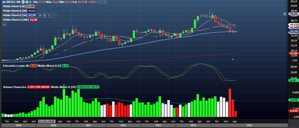 No gráfico mensal, vemos WEGE testando a MM50, algo que no passado recente só ocorreu em Maio-22 e Dezembro-23.